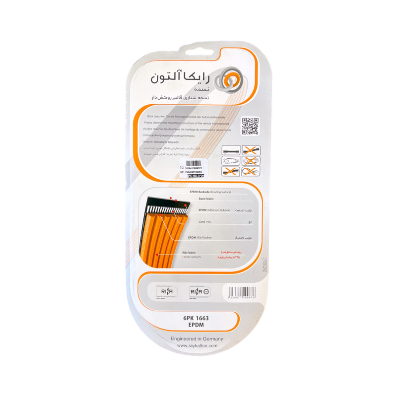 تسمه دینام رایکالتون.با پوشش پارچه(تقویت شده).دارای طول عمر بسیار بالاتر از نمونه های مشابه.دارای کیفیت ساخت EPDM .مقاوم در برابر ترک خوردن و گرما و سرما. از لاستیک ساخت این تسمه در ساخت لاستیک هواپیما نیز استفاده میشود که دارای استحکام بسیار بالایی میباشد. محصولی با کیفیت و خواص با ارزش خرید بسیار بالا.